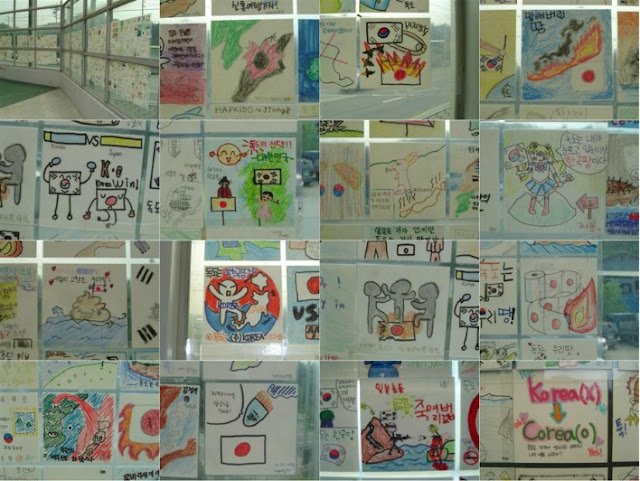 ソウル市郊外キュルヒョンの地下鉄駅構内に展示された絵画展における小中生徒達の作品。日本の国旗を踏みつけたり、日本に爆弾を落としたり、日本を焼き払う絵が溢れている。